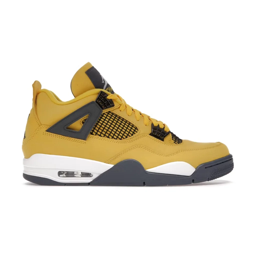Amarillo vibrante con detalles negros y gris, piel premium y suela resistente. Un Jordan 4 llamativo con estilo atrevido y vibra street.
